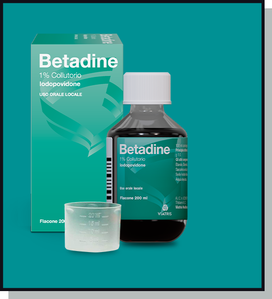 - Betadine Gel, Betadine Soluzione Cutanea, Betadine Garze Impregnate, sono medicinali a base di Iodopovidone. Sono medicinali che possono avere effetti indesiderati anche gravi. Non somministrare ai bambini al di sotto dei 6 mesi di età. Prima dell‛uso leggere attentamente il foglio illustrativo. Betadine Collutorio è un medicinale a base di Iodopovidone. È un medicinale che può avere effetti indesiderati anche gravi. Non somministrare ai bambini al di sotto dei 6 anni di età. Prima dell‛uso leggere attentamente il foglio illustrativo. Betadine soluzione vaginale è un medicinale a base di Iodopovidone. È un medicinale che può avere effetti indesiderati anche gravi. Prima dell‛uso leggere attentamente il foglio illustrativo. Betadine compresse vaginali è un medicinale a base di Iodopovidone, è un medicinale senza obbligo di prescrizione (SOP) che può essere consegnato solo dal farmacista. Ascolta il tuo farmacista. Aut. Min. 29/08/2022. Beta-2022-0220.