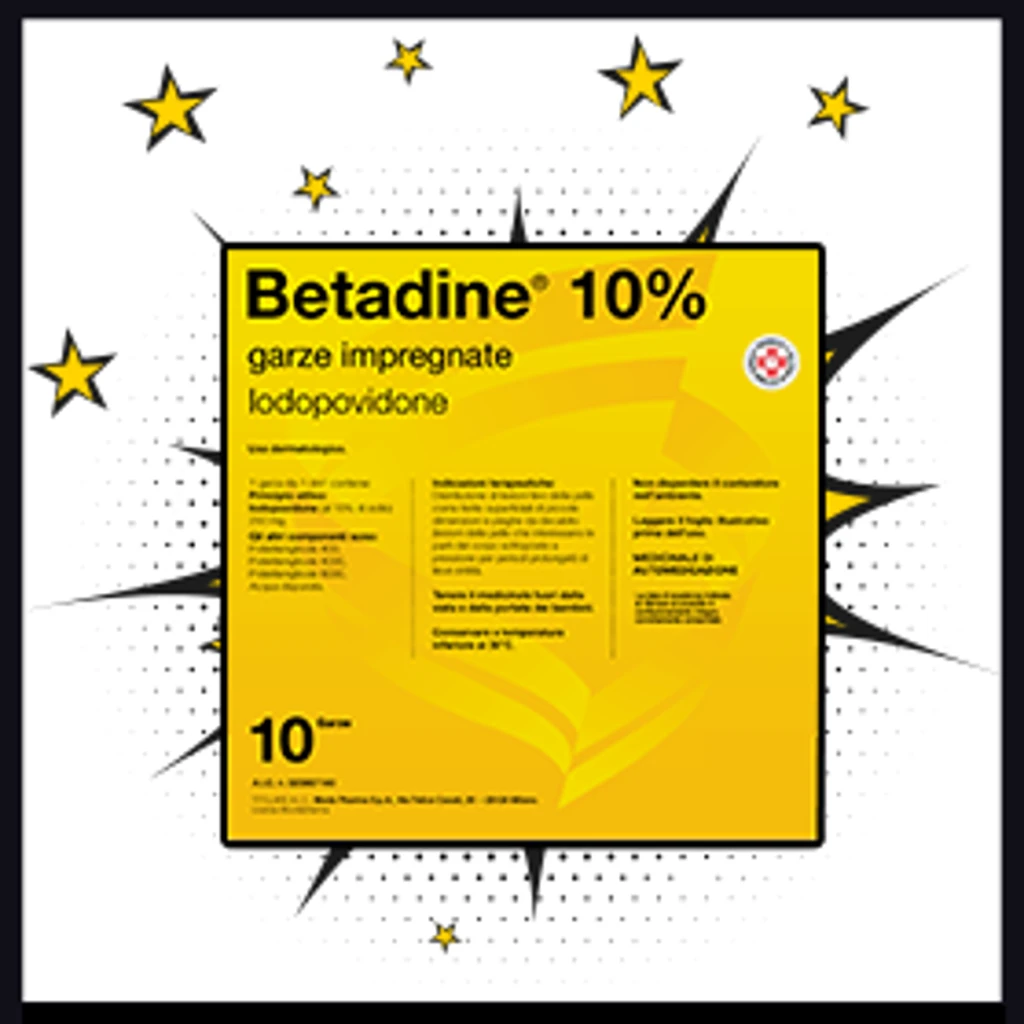 Betadine® 10% garze impregnate è un medicinale a base di Iodopovidone che può causare effetti indesiderati. Non somministrare ai bambini di età inferiore a 2 anni. Prima dell’uso, leggere attentamente il foglietto illustrativo e seguire le istruzioni. Non superare la dose indicata senza il parere del medico. Utilizzare questo medicinale solo per brevi periodi di tempo.